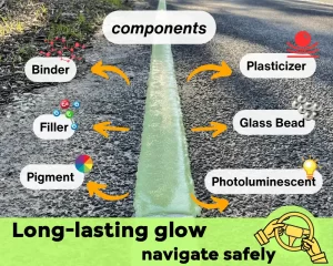 เมื่อพูดถึงเรื่องความปลอดภัยบนท้องถนน ทัศนวิสัยมีบทบาทสำคัญในการป้องกันอุบัติเหตุ และทำให้การจราจรคล่องตัว นวัตกรรมอย่างหนึ่งที่ได้รับความสนใจในช่วงไม่กี่ปีที่ผ่านมา คือการใช้เครื่องหมายจราจรเรืองแสงในที่มืด โดยใช้วัสดุเทอร์โมพลาสติกชนิดเรืองแสงในการตีเส้นจราจร ซึ่งมีข้อดีหลายประการที่เหนือกว่าเครื่องหมายจราจรแบบดั้งเดิม